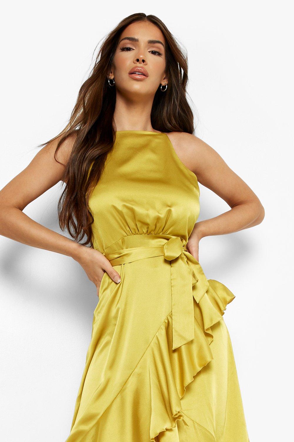 Satin frill 2025 wrap midi dress